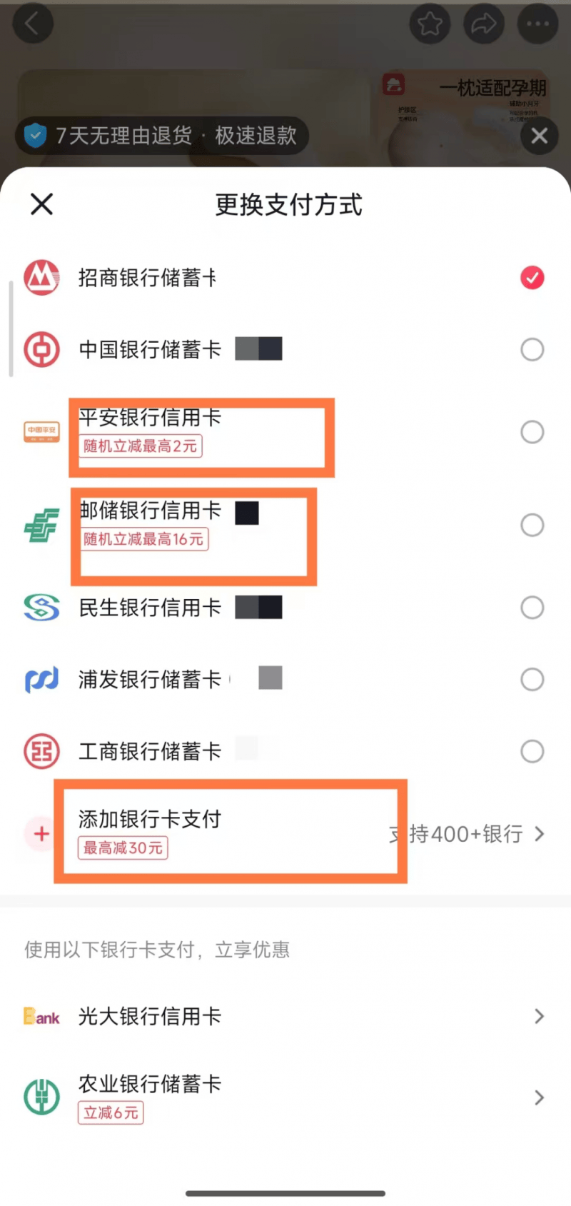 抖音支付支持绑定400+合作银行卡(覆盖工行、农行、招行等),消费时选择有立减活动的银行卡进行支付,可享至高20元立减优惠,可在购物消费、团购餐饮和信用卡还款等场景中使用,并且还支持叠加平台/商家优惠同步使用。