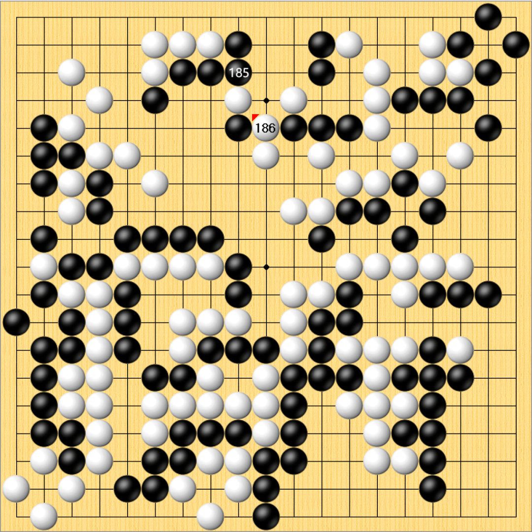 简单吃过午饭后,续弈开始,棋局也出现了变化。丁浩在左边的二路跳下明显是产生了误算,芈昱廷抓住机会反击,棋局回到五五开。此后的一段时间里,两人错进错出都错过了不少机会。185手,芈昱廷下出了败着。