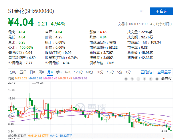 截至6月3日,ST金花再度一字跌停,股价为4.04元/股,总市值15.08元。这与其在2015年巅峰期的市值已蒸发超80%。